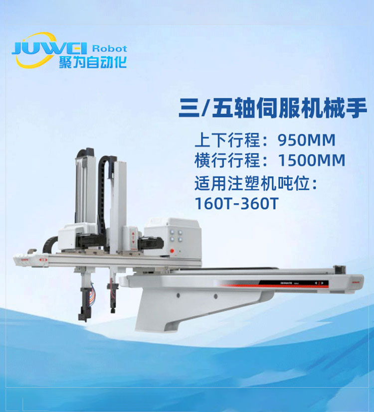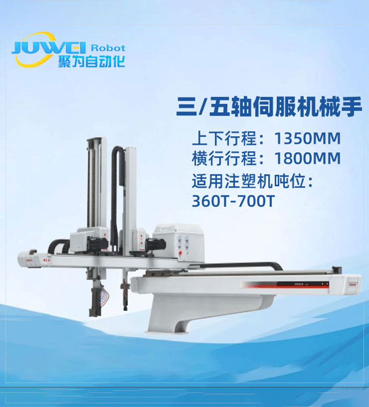 1.伺服主臂+1伺服料臂, 双臂 五轴 伺服 机械手 这种结构是市面上最常用的五轴伺服机械手 结构,首要用于冷流道三板模注